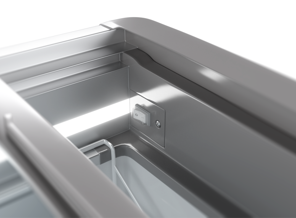 - Электронное управление, сенсорный дисплей: Хорошо читаемый дисплей, отображает температуру внутри ларя, выдает коды ошибок самодиагностики, защищен паролем от несанкционированных изменений.